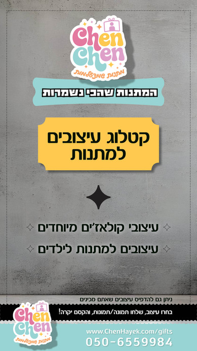לכל מתנה מתווסף צ'ופר של כרטיס ברכה או גלויית ברכה, כדי שתוכלו לכתוב איחולים בכתב היד שלכם, או פשוט לכתוב ממי המתנה :)